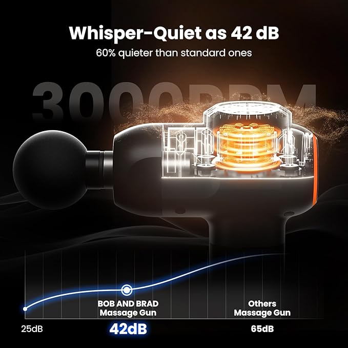 Whisper Quiet & 10-Minute Auto Shut-off: Equipped with an intelligent chipset, the massage gun automatically shuts off after 10 minutes of use, preventing overuse and potential harm to the body. Utilizing advanced noise reduction technology, it operates at a whisper-quiet level as low as 40 decibels, quieter than most massage guns.